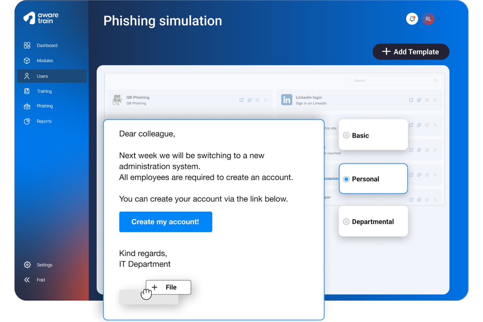 Unsere Philosophie lautet, dass eine Kampagne für Sicherheitsbewusstsein kontinuierlich sein sollte. Einmalige Schulungen werden schnell vergessen. Sicherheitsschulungen sind daher ein fortlaufender Prozess und kein einmaliges Projekt. Durch regelmäßiges Training und ständige Sensibilisierung Ihrer Kolleginnen und Kollegen stellen Sie sicher, dass Cyber-Sicherheit stets im Fokus bleibt. Das verringert das Risiko von Datenpannen und hilft Ihnen, eine starke menschliche Firewall aufrechtzuerhalten. Mit Awaretrain können Sie ganz einfach ein umfassendes Sicherheitsbewusstseinsprogramm für mehrere Jahre implementieren. Unsere Schulungen sind kurzweilig und ansprechend, sodass Ihre Kolleginnen und Kollegen engagiert, motiviert und aufmerksam bleiben.
