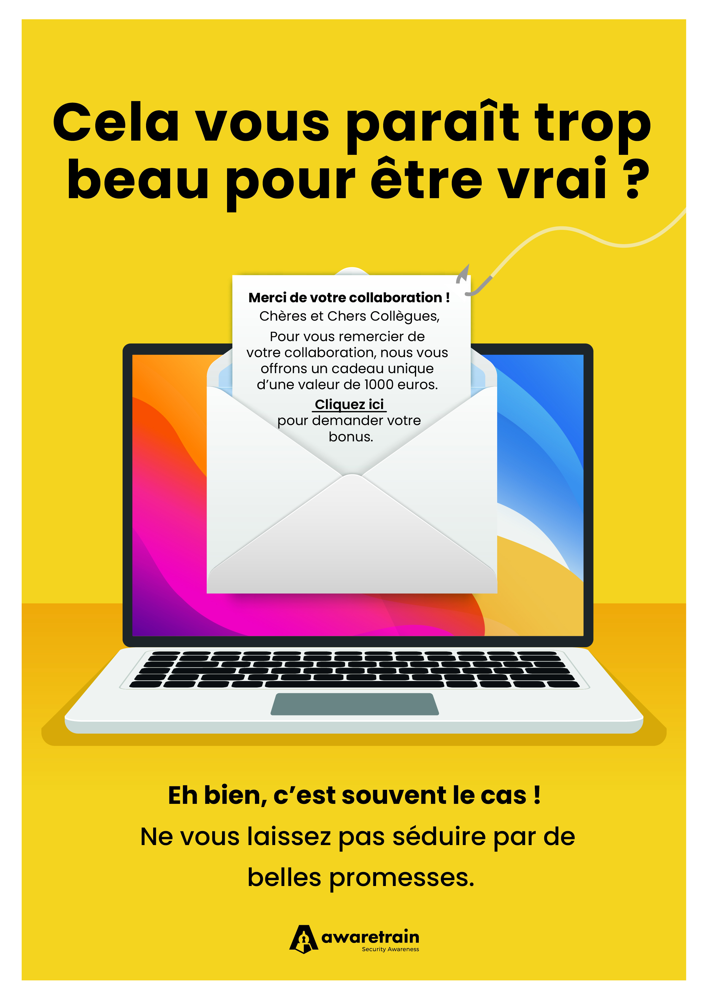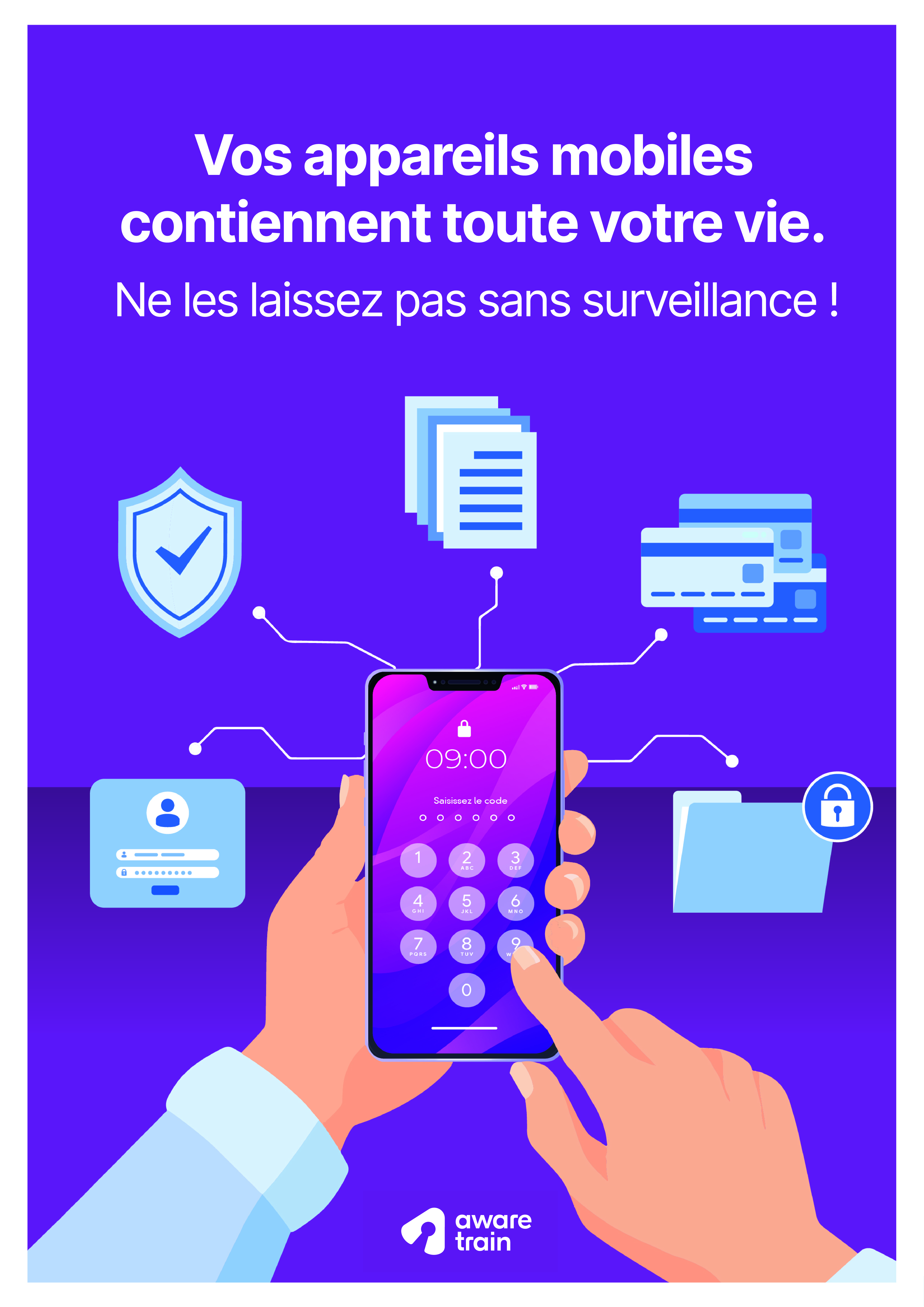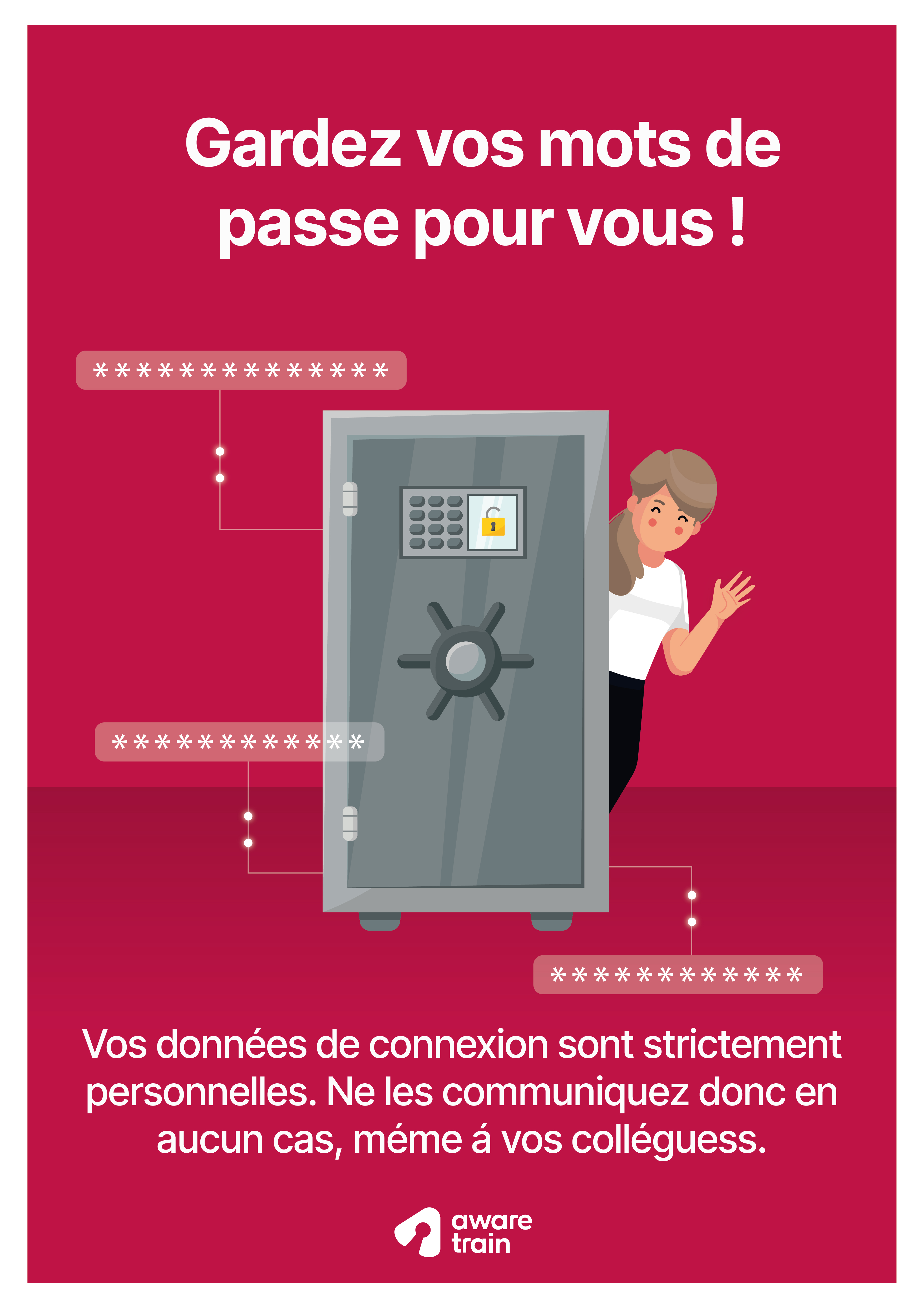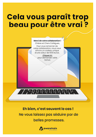Téléchargez nos affiches ludiques et posters gratuits sur la Sensibilisation à la cybersécurité couvrant les données personnelles, les mots de passe, l’hameçonnage, la sécurité sur le lieu de travail et bien plus encore. Utilisez-les dans vos communications numériques, imprimez-les et affichez-les dans vos bureaux.